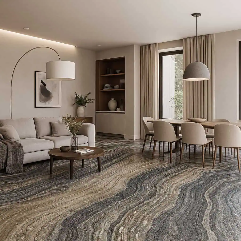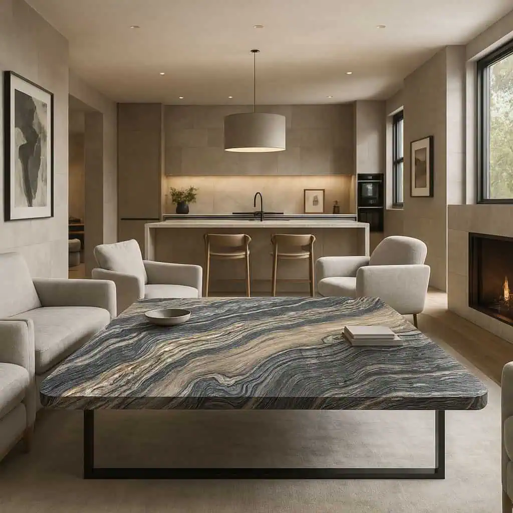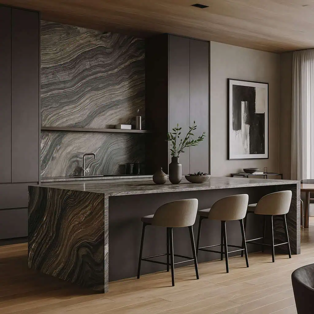 Brown Wave Marble pairs beautifully with walnut and oak cabinetry, brushed nickel or black hardware, and warm, layered lighting. For a more architectural feel, contrast it with crisp white walls, charcoal joinery, or honed concrete-look finishes to let the stone’s movement take centre stage.