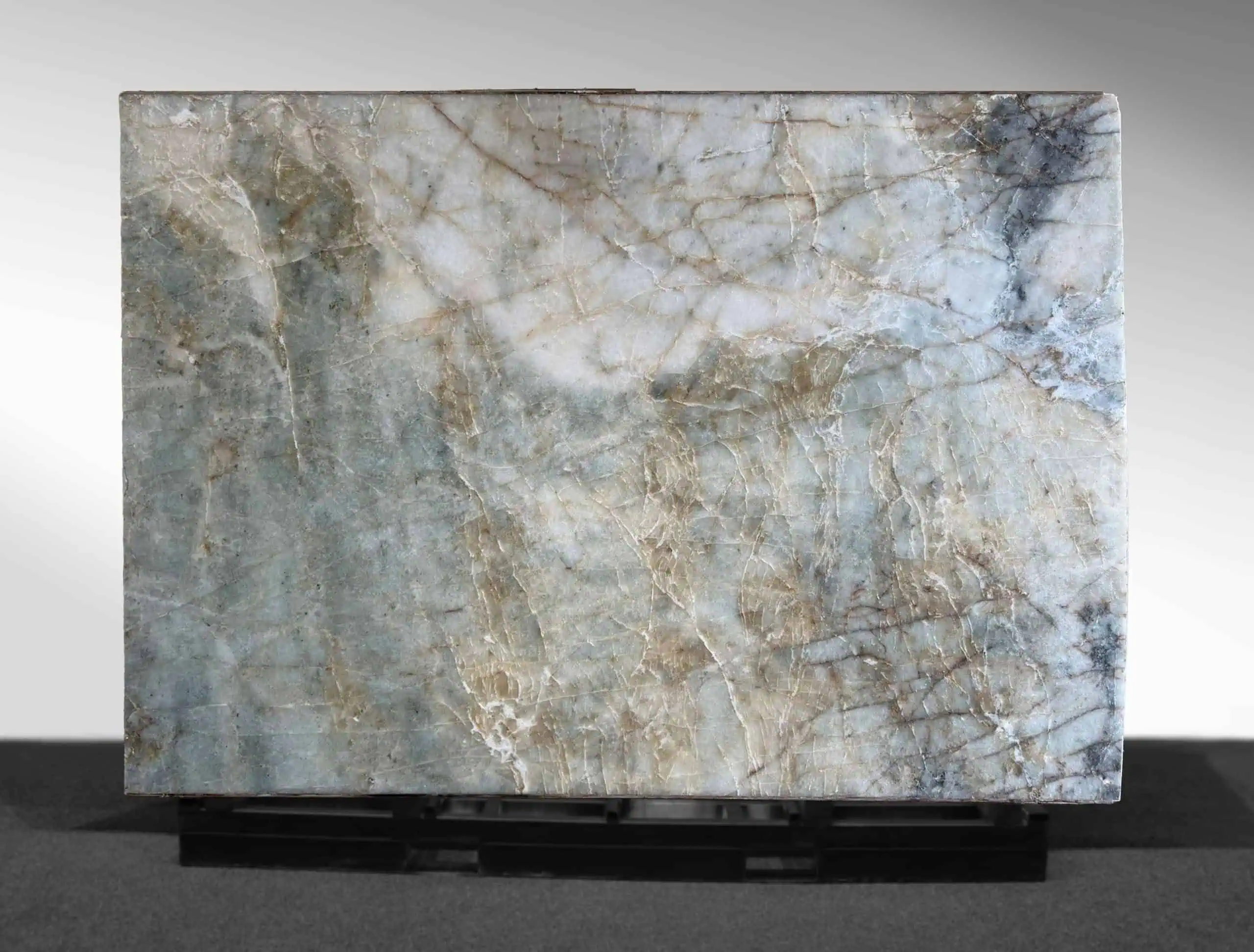 Pair Cristallo Aqua with warm timber, brushed brass or champagne hardware to draw out its subtle gold and taupe notes, or lean into a cooler architectural palette with matte black details and pale grey joinery. Layered lighting—especially wall washing—can elevate the stone’s depth and natural crystalline movement.