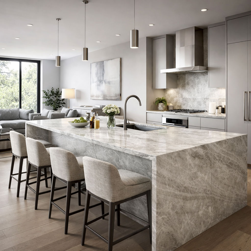 Taj Vittoria Quartzite Slab is a versatile surface solution for both residential and commercial spaces. It is particularly suited to natural stone benchtops, feature walls, bespoke furniture elements, and elegant floor or wall installations. In kitchens, its honed finish offers a contemporary, tactile feel that pairs beautifully with timber joinery, brushed metal fixtures, warm whites and soft greige cabinetry. In bathrooms and commercial interiors, it introduces a serene, grounded aesthetic while maintaining the premium look expected of a high-end natural stone slab.